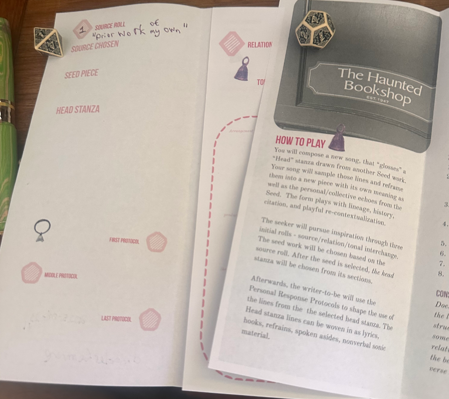 Your song will sample those lines and reframe them into a new piece with its own meaning, inspired by the poetic form of the glosa.This form plays with lineage, history, citation, and playful re-contextualization. The game comes as a trifold print and play set of rules and a songsheet to use if desired.